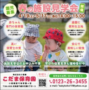 施設見学会を5月17日土曜日14時から15時に開催します。 ご予約不要で、ご参加いただけます。平日の保育見学をご希望の方は、お電話/お問合せフォームからご予約ください。 14時から保育園のご紹介やスキンシップ遊び、ペープ […]