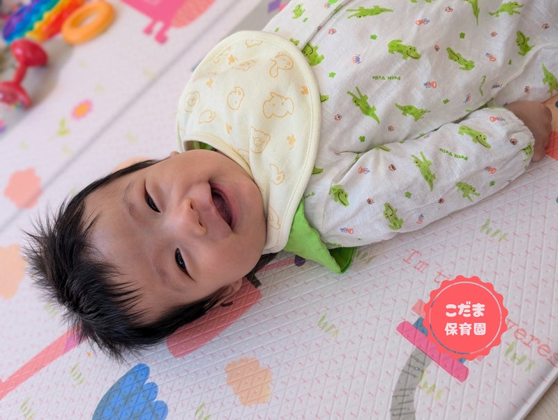 うつ伏せ遊びが上達中の子は、月齢の大きな子に交じって遊んでいます。