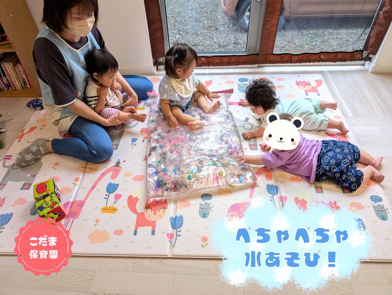 蒸し暑い日の保育時間では、ウォータークッションで水の感触を楽しんでいます。
