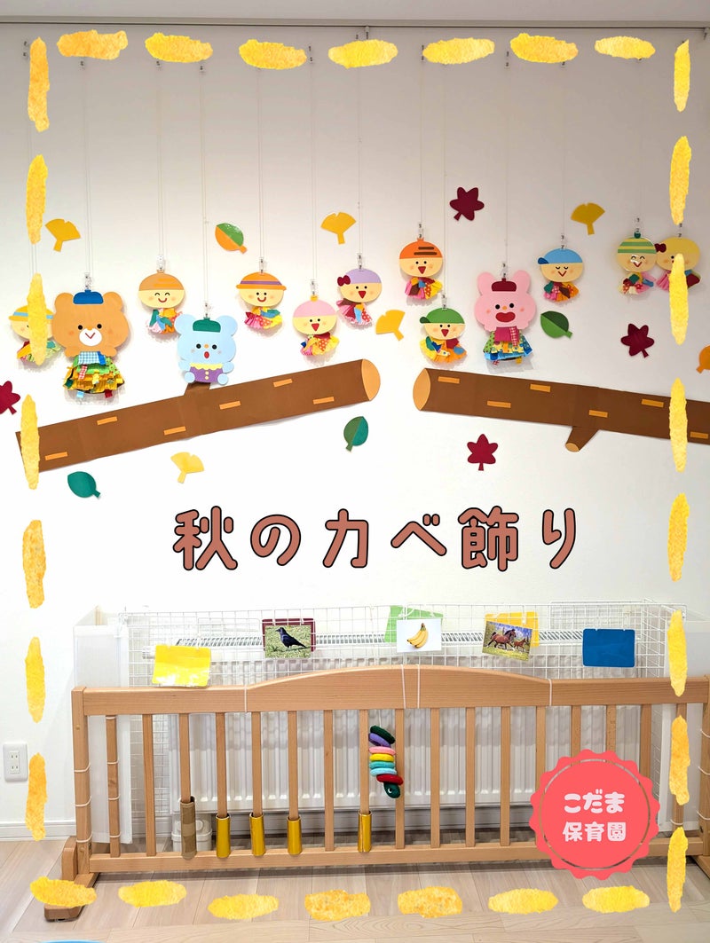 9月も後半になり、保育園の壁飾りは秋模様に衣替えしました。