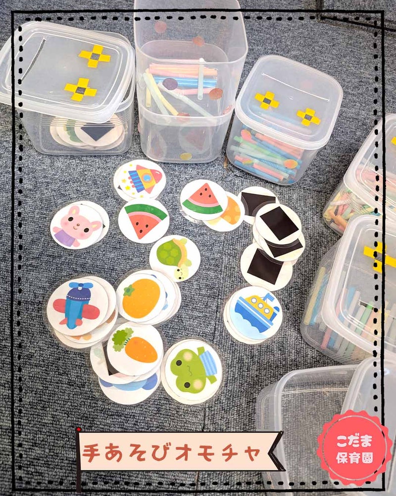 子供達は、容器の穴に、ストローやカードを入れて楽しみます花