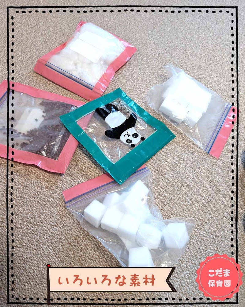 他にも、小さなビニール袋にいろいろな素材を入れて遊びました。