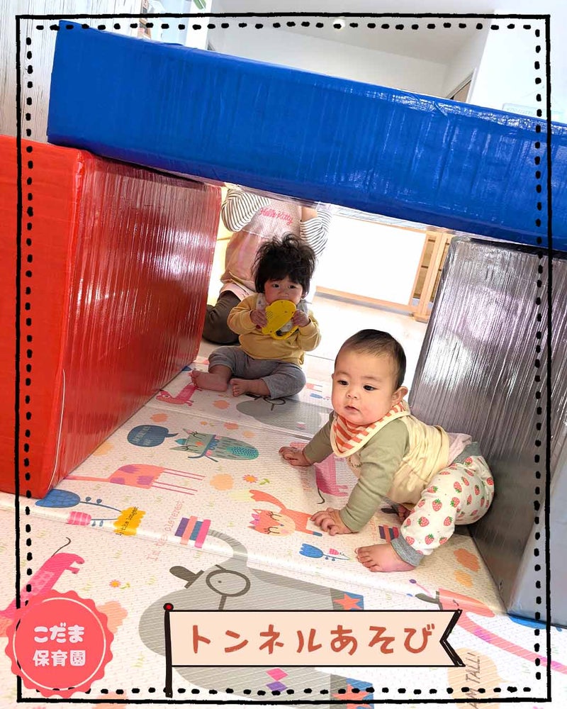 保育園内では、大型積み木を組み立てて“トンネルあそび”をしました。