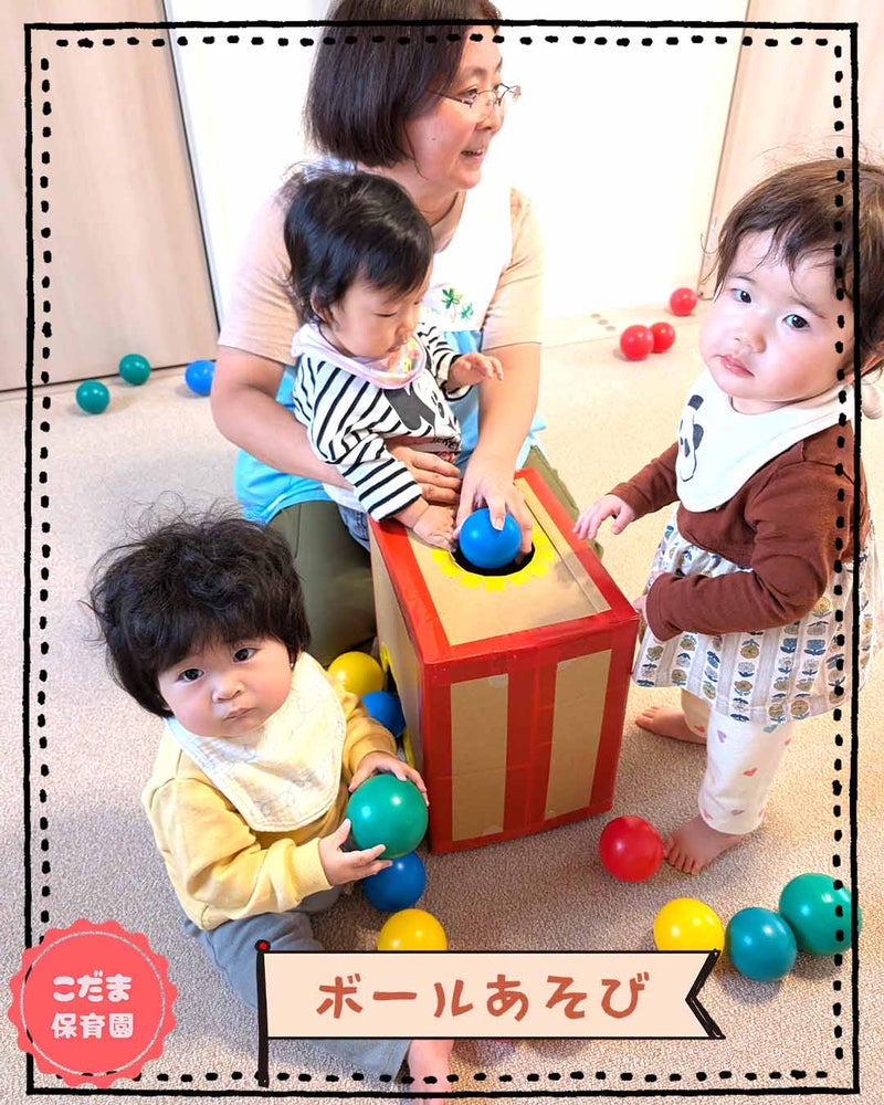 パネルブロックの穴に向かって、球型やボトル型のガラガラおもちゃを入れて楽しみました。